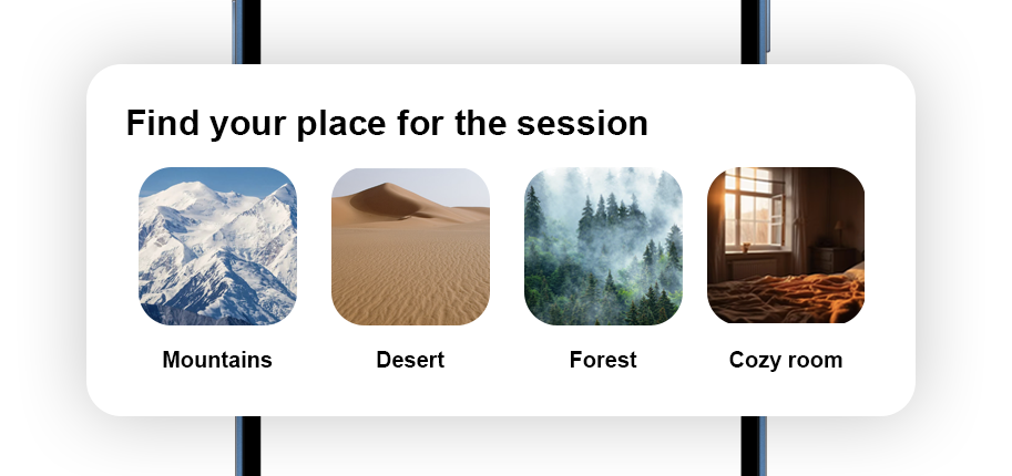 Decide how much time you have — and the app will shape your perfect session. Even a few minutes can bring clarity and reset your energy. When you have more time, longer sessions allow for deeper relaxation and self-connection. No matter your schedule, there’s always time to feel better
